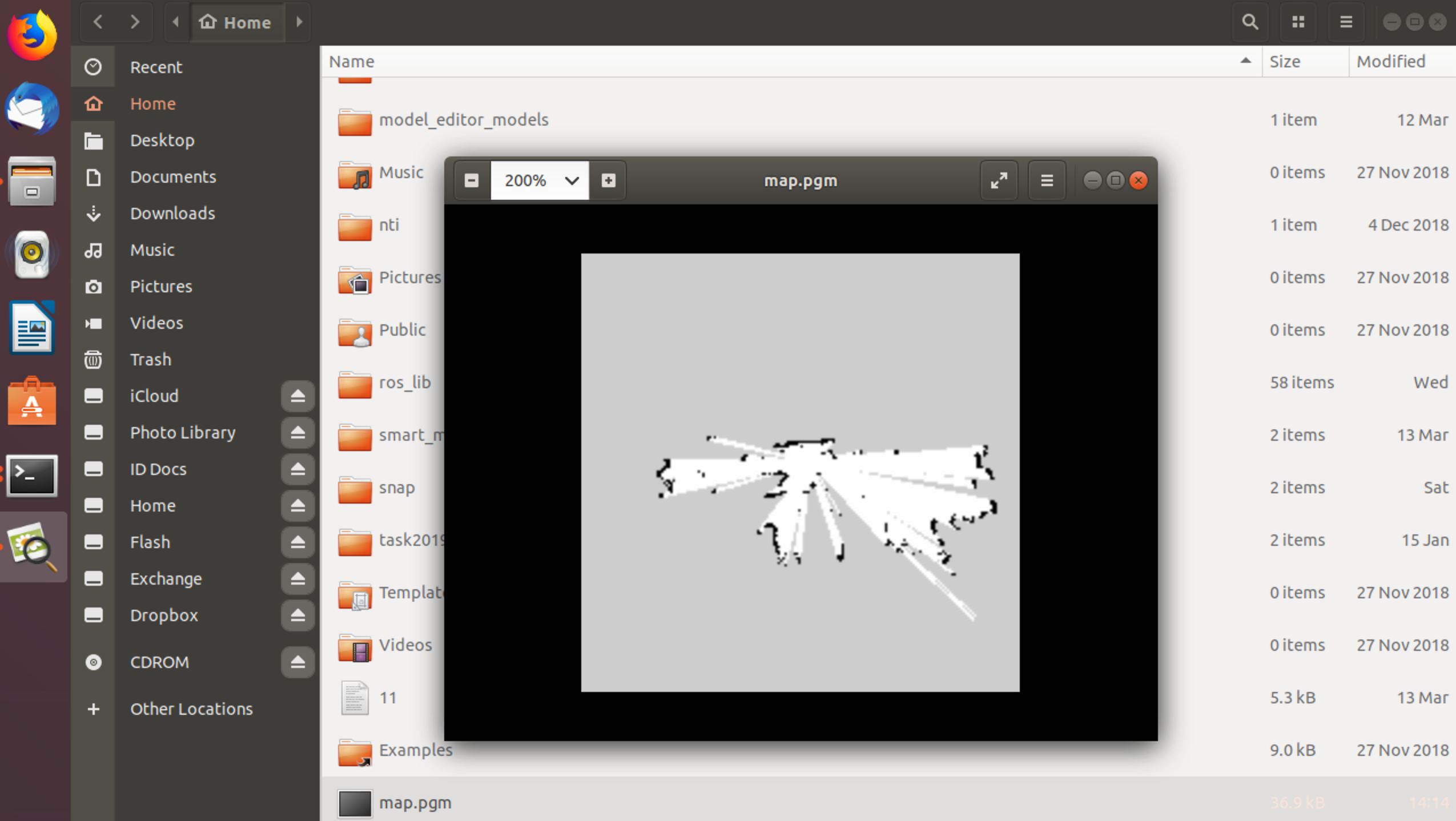 Файл map.pgm это графический файл формата .pgm, его можно открыть программой просмотра изображений Ubuntu. Но так как map.yaml и map.pgm были сохранены на роботе, то для открытия файла map.pgm его сначала нужно перенести на компьютер воспользовавшись командой scp в консоли на компьютере: