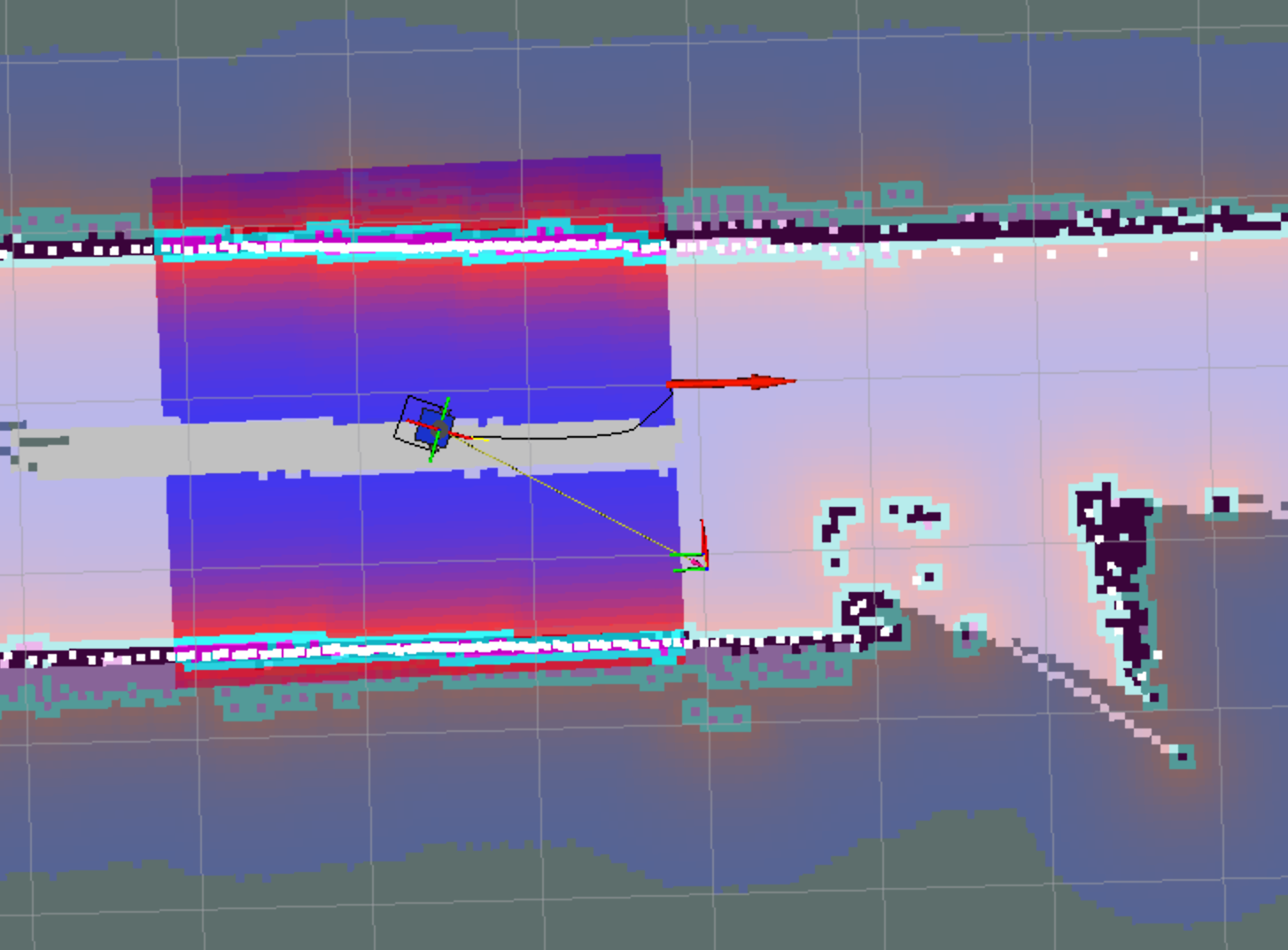 Мы увидим работу всего нашего стека навигации, серую глобальную карту "costmap" и видим большой прямоугольник с локальной costmap. Чем ближе отображенный цвет к красному, тем выше "стоимость", также виден путь прокладываемый планировщиком.