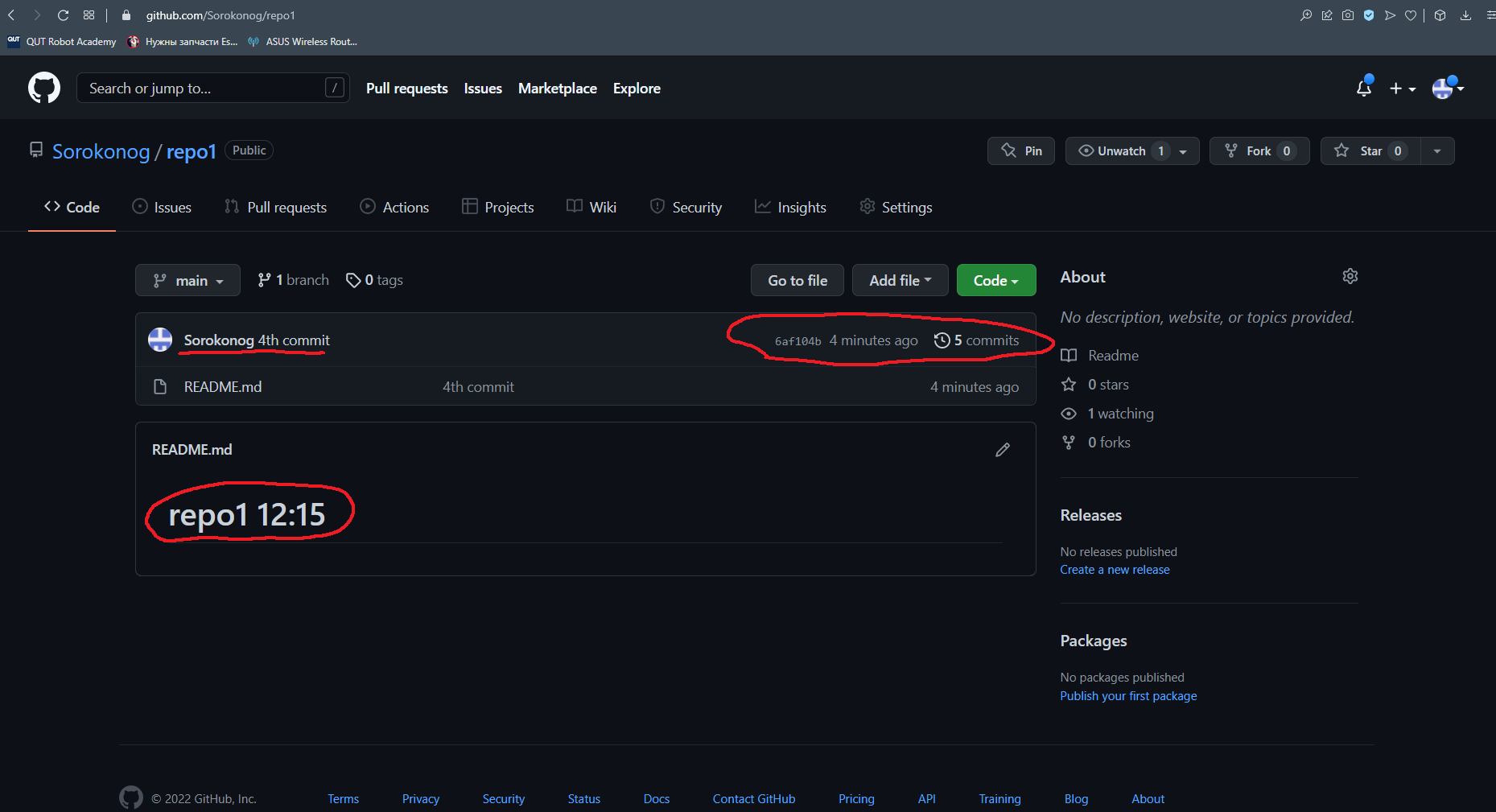 Все так как мы и ожидали, текущее состояние репозитория это то состояние файла README.md которое мы изменили последним. Однако не смотря на то, что git push мы делали только один раз, после "четвертого" коммита, коммитов стало пять. Т.е. в один push вошло сразу два коммита "третий" и "четвертый". Это связано с тем, что git push не добавляет ничего в состояние репозитория, а только синхорнизирует локального клона репозитория с удаленным клоном. Т.е. мы можем накапливать коммиты в течение рабочего дня, а затем одним пушем отправить их на GitHub, перед тем как пойти домой.