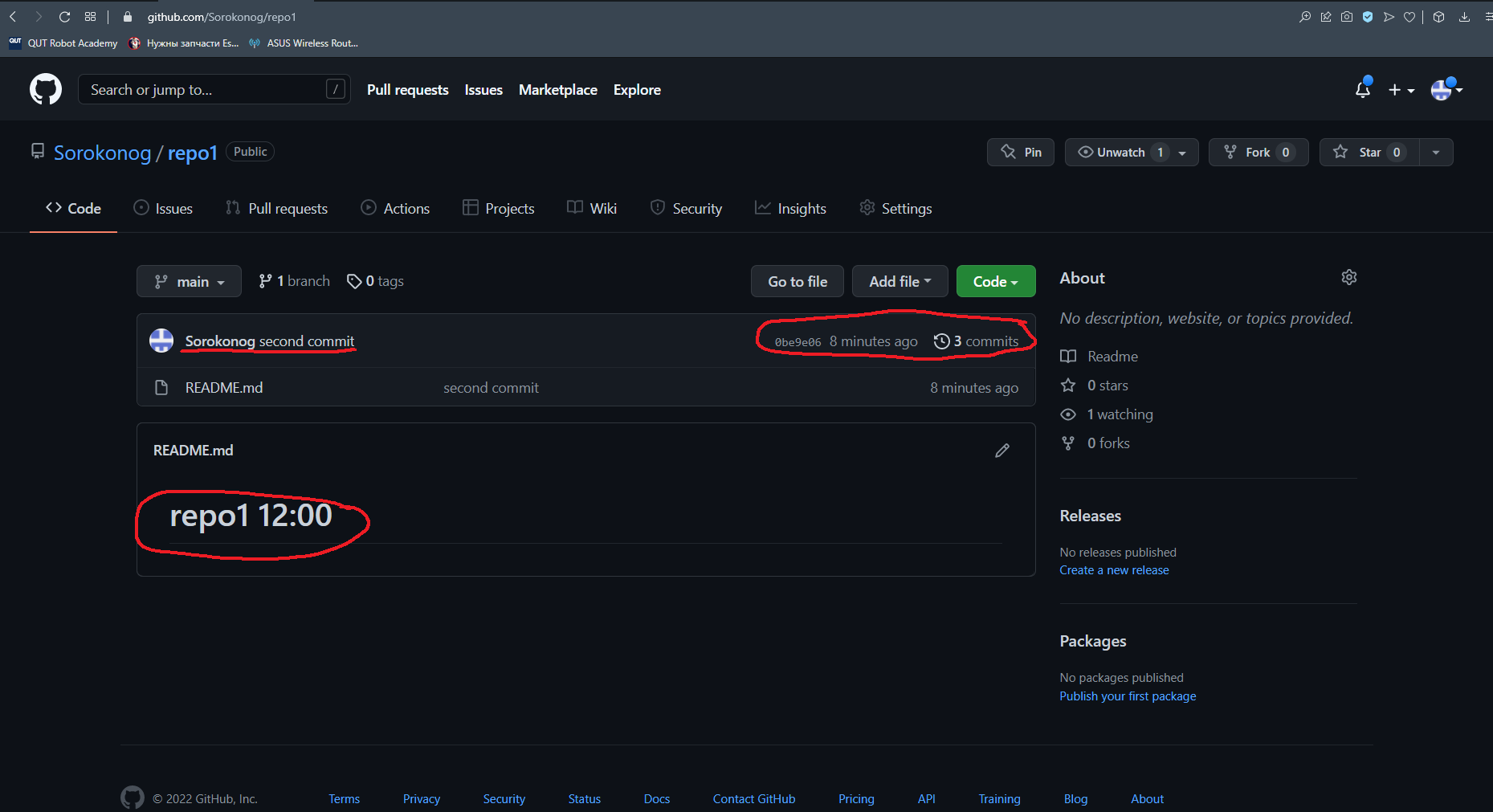 Сделаем два изменения времени в файле README.md и закоммитим их последовательными коммитами
