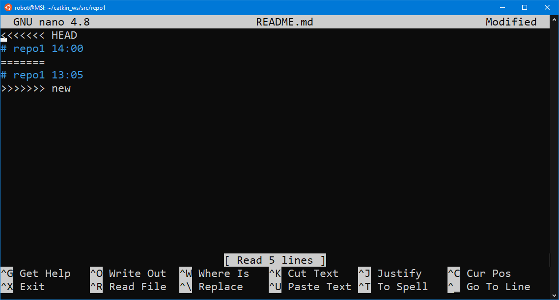 Существуют различные способы решения данного конфликта, и пытливые учащиеся могут самостоятельно поискать эти способы, но мы поступим достаточно прямолинейно. Отредактируем файл README.md в nano, оставив ту версию, которая нам больше нравится