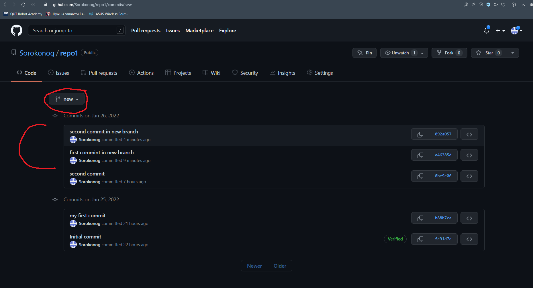 В списке веток появилась ветка new, и в ней все сделанные коммиты на текущий момент.