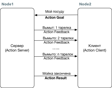 Модель коммуникации в режиме Действие (Action) используется, когда выполнение запрошенной команды занимает продолжительное время и необходима обратная связь с процессом. Это очень похоже на модель Service: (Service Request) используется как Задача (Action Goal), а ответ (Service Response) используется как Результат (Action Result). Также есть дополнительная сущность Обратная Связь (Action Feedback) для передачи промежуточных результатов выполнения процесса для клиента. После отправки запроса (Action Goal) программа может продолжать работать, "отвлекаясь" только на обработку или Результата (Action Result), или промежуточного состояния (Action Feedback). Такой метод работы будет асинхронным.