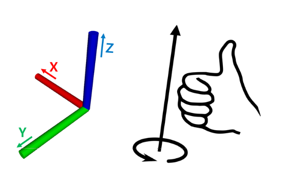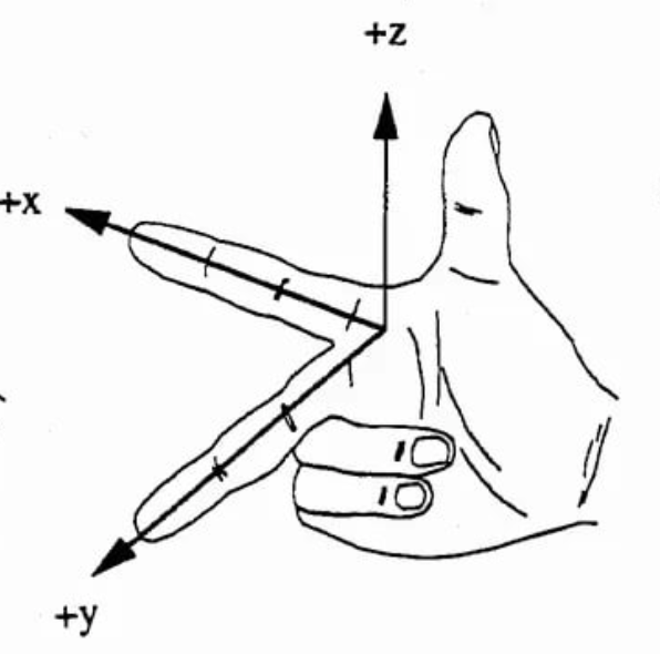 Чтобы запомнить направления, вы можете расположить большой, указательный и средний палец в форме трех осей как показано на рисунке.